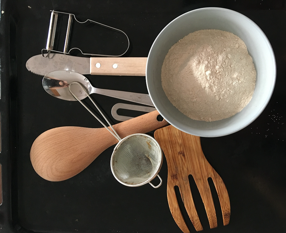 1. Vezměte si mouku, sítko, plech a různé kuchyňské náčiní.